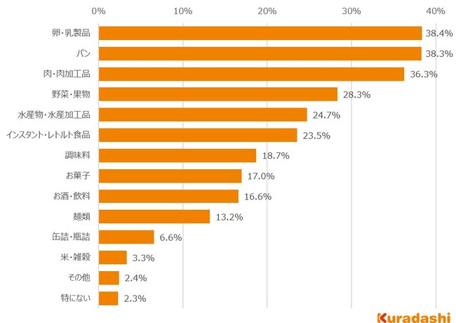 特に値上げされていると感じる食品は「卵・乳製品」が最も多く38.4%、次いで多かった回答は「パン」で38.3%、「肉・肉加工品」で36.3%でした。
