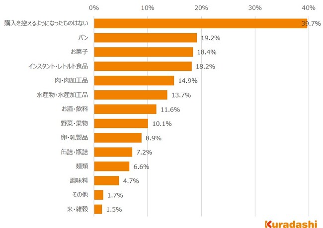 「購入を控えるようになったものはない」という回答が最も多く39.7%でしたが、「パン」や「お菓子」、「インスタント・レトルト食品」は20%弱の人が購入を控えるようになったと回答しています。