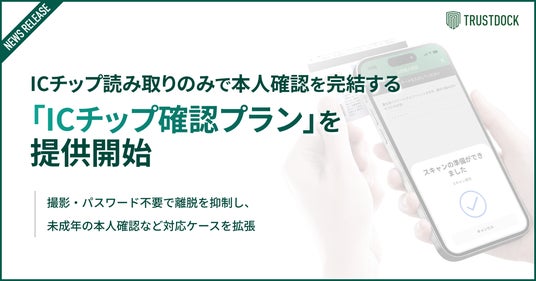 株式会社TRUSTDOCK(本社:東京都中央区、代表取締役:千葉 孝浩)は、eKYC(オンライン本人確認)サービス「TRUSTDOCK」において、ICチップ読み取りのみで本人確認を完結できる「ICチップ確認プラン」を提供開始しました。