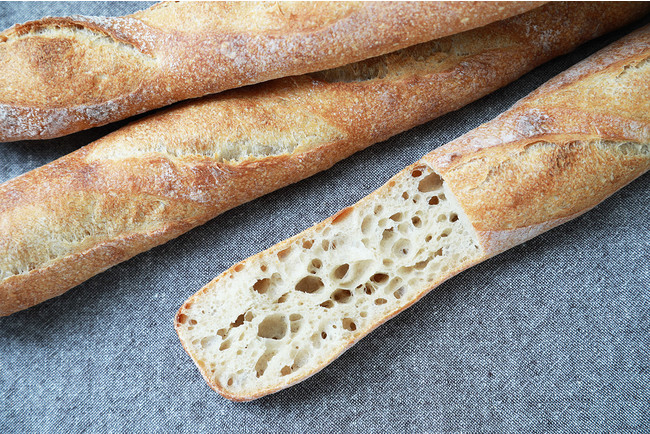 自家製粉の小麦粉を使用し、小麦の旨味を充分に引き出しました。外はパリッと、中はしっとりと食べやすく、口の中にふわっと広がる小麦の旨味をご賞味いただけるバゲットに仕上げました。シンプルながらもコクのある味わいは、そのままでもサンドイッチにしても絶品です。