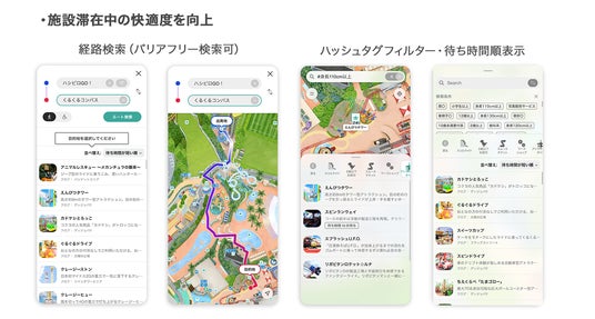 「よみランデジタル集遊マップ」は、複数施設のマップを同時にデジタルマップ化することで、施設間の回遊を促進するとともに、お客様の利便性の向上、紙マップの印刷や廃棄の削減を通してSDGs達成に貢献します。各施設の経路検索や条件検索、アトラクションの待ち時間などの混雑状況が手元のスマートフォンですぐにわかるため、来場者はより快適で効率的に施設内を回れるようになります。また、11言語に対応し、近年来場が増えている訪日外国人の方々もストレスなく利用できます。加えて、最新情報をリアルタイムで更新できるため、頻繁に変動する施設情報を正確に来場者の皆様にお届けできます。