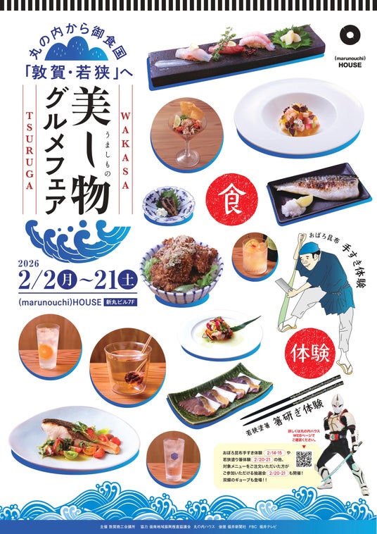 新丸ビル7階「丸の内ハウス」は、福井県の敦賀(つるが)・若狭(わかさ)地域の食材を使ったオリジナルメニューを、フロア内の飲食店全12店舗で提供する『丸の内から御食国「敦賀・若狭」へ 美し物-うましもの-グルメフェア』を2月2日(月)より開催します。