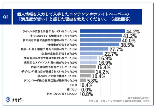 Q1で「かなりある」「ややある」と回答した方に、「Q2.個人情報を入力して入手したコンテンツやホワイトペーパーの「満足度が低い」と感じた理由を教えてください。(複数回答)」(n=260)と質問したところ、「タイトルや広告と内容が合っていなかったから」が44.2%、「すでに知っている情報ばかりだったから」が41.2%、「表面的な内容で具体的な情報がなかったから」が40.0%という回答となりました。
