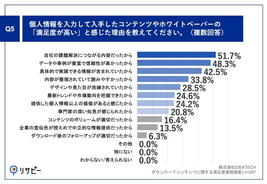 Q4で「かなりある」「ややある」と回答した方に、「Q5.個人情報を入力して入手したコンテンツやホワイトペーパーの「満足度が高い」と感じた理由を教えてください。(複数回答)」(n=207)と質問したところ、「自社の課題解決につながる内容だったから」が51.7%、「データや事例が豊富で信頼性が高かったから」が48.3%、「具体的で実践できる情報が含まれていたから」が42.5%という回答となりました。