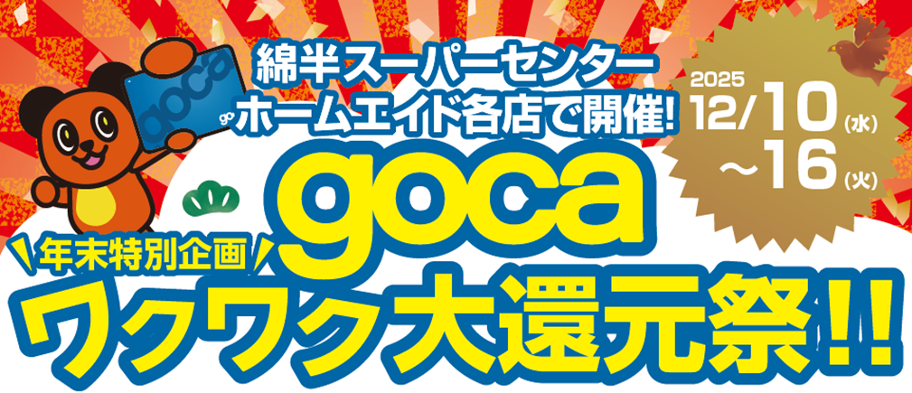 ※本キャンペーンは、2025年12月10日(水)~12月16日(火)の期間中、綿半スーパーセンターおよび綿半ホームエイド各店舗にてgocaプリペイドカードへチャージされた金額が対象です。チャージ金額の3%を即時還元します。