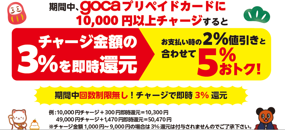 期間中、gocaプリペイドカードに10,000円以上をチャージしていただくと、チャージ金額の3%を即時還元(プリペイド残高に反映)します。通常サービスの「お支払い時2%値引き」と合わせると、実質5%分が還元される大変お得なキャンペーンです。