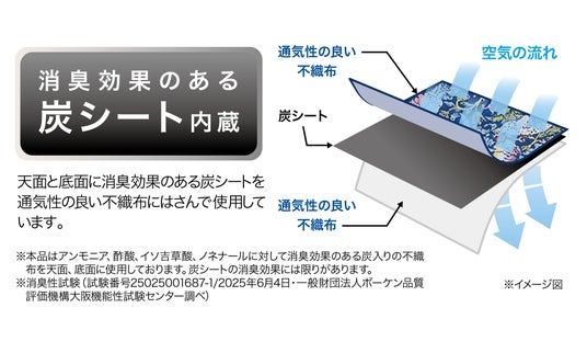 天面と底面に消臭効果のある炭シートを通気性の良い不織布で挟んでいるので、消臭対策ばっちり、ニオイ移りを防いでくれます。