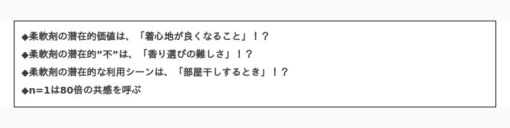 柔軟剤の潜在的価値は「着心地が良くなること」、潜在的“不”は「香り選びの難しさ」