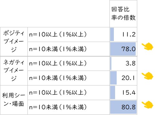 次に、自由記述形式(n=1000)において、n=10以上(1%以上)とn=10未満(1%未満)に分類した上で、それらの倍数の平均値を算出して比べてみました。