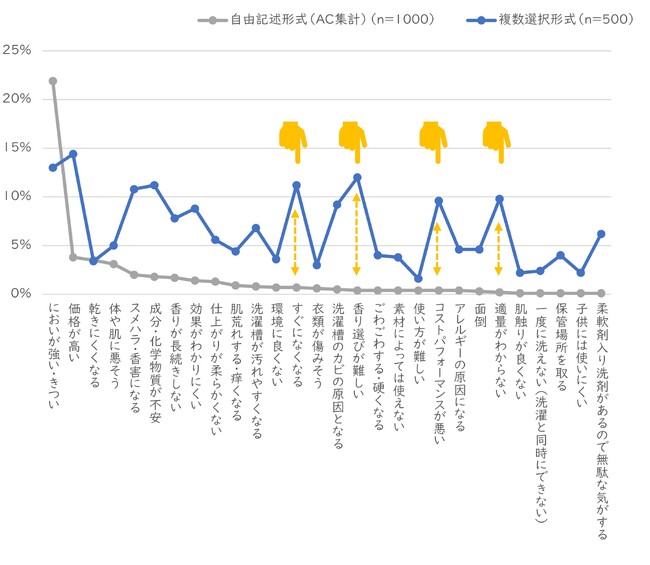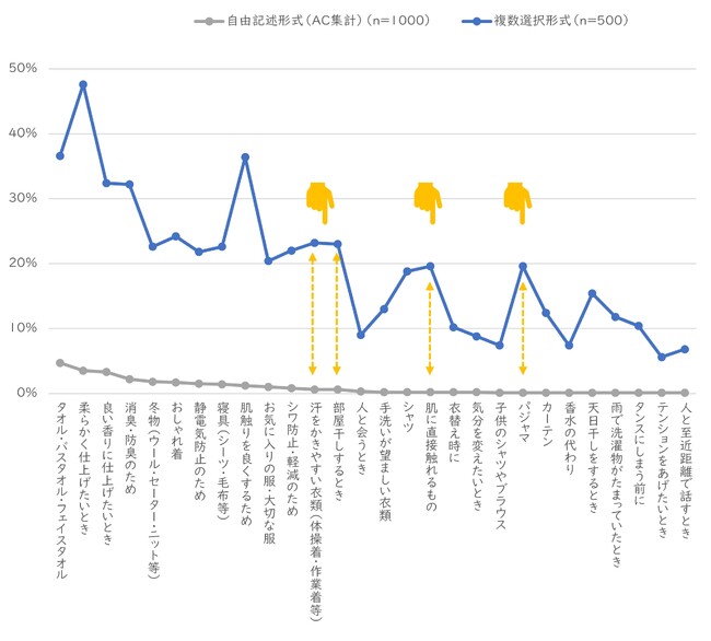 例えば、「着心地が良くなる」「香りが長続きする」「除菌・抗菌・殺菌してくれる」は、自由記述形式では極僅かな意見ですが、複数選択形式では20%~40%の人が選択しています。