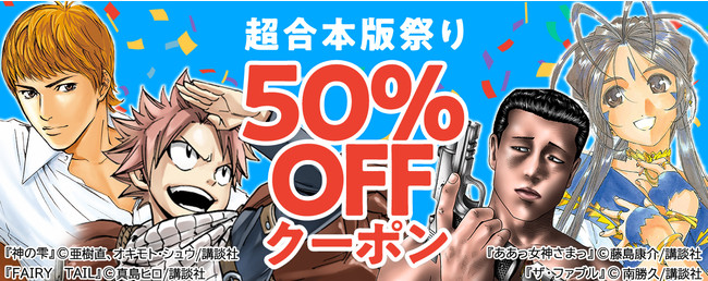 多くの男性読者に支持されている講談社の人気作品、その超合本版シリーズを対象とした「超合本版祭り」。『ザ・ファブル』『FAIRY TAIL』などの超合本版シリーズ、計400冊以上に使える50%OFFクーポンを、期間限定で配布いたします。また、一部の作品は、冒頭1巻が無料となります。春休みはまとめ読み必至! 7日間限定のお祭りをぜひお楽しみください。