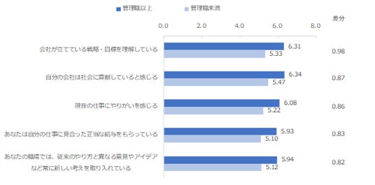 役職別に従業員エンゲージメントに影響を与える項目の評価を比較したところ、管理職以上の回答者の評価はいずれの項目でも管理職未満の回答者の評価を上回りました。最も差分が大きくなったのは「会社が立てている戦略・目標を理解している」となり、次いで「自分の会社は社会の貢献していると感じる」、「現在の仕事にやりがいを感じる」といった項目が続きました。従業員エンゲージメントにも高い影響を与える項目である、会社の方向性や社会に対する貢献性、また仕事のやりがいにおいて、役職間での評価が大きく乖離している結果となりました。