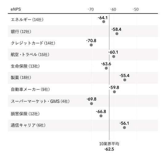 1. 全10業界で最もeNPSが高いのは製薬業界、10業界の平均は-62.5