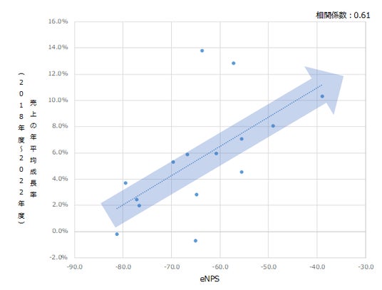 また、例として生命保険、銀行、損害保険、およびエネルギー(電力・都市ガス)の業界の企業を対象に、各社の売上の年平均成長率(2018年度~2022年度)とeNPSとの関連を分析したところ、eNPSが高い企業は売上の年平均成長率も高くなる傾向がみられました。
