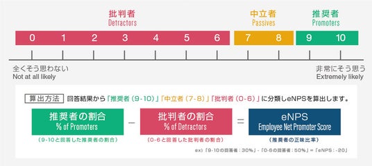 eNPSは従業員の職場に対する信頼や愛着度など従業員エンゲージメントを測る指標となります。就職先として自身の職場を薦めたいか?」という就職先としての推奨度合いを聴取し、回答結果から「推奨者(「9」~「10」の回答者)」、「中立者(「7」~「8」の回答者)」、「批判者(「0」~「6」の回答者)」に分類し、推奨者の割合から批判者の割合を引いた値をeNPSとして算出します。