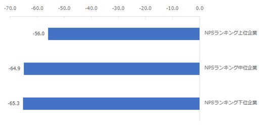 「NPSベンチマーク調査」の調査結果のNPSランキング別にeNPSを分析したところ、「NPSベンチマーク調査」でNPSランキングの上位企業のeNPSは-56.0ポイントと中位・下位企業よりも高く、顧客ロイヤルティが高い企業ほど従業員エンゲージメントも高い傾向がみられました。