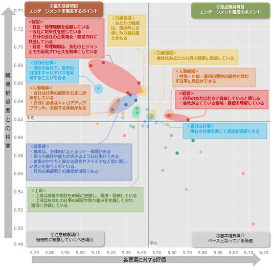 一方でエンゲージメントを阻害し、今後の改善が求められる項目としては経営側に対する信頼や共感、将来性についての項目「経営・管理職層を信頼している」など)となりました。また、職場の連帯感(「あなたの職場は、個々の個性や能力が活きるような仕事ができる」など)やキャリア形成に関連した項目(「現在の会社で、自分の目指すキャリアパスを実現することができる」)のほか、職場の風土や上司からの評価などで不満がみられる結果となりました。