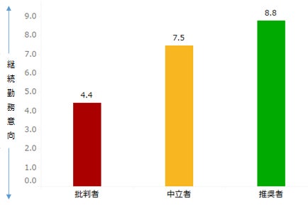 今後も同じ職場で働きたいと思うか、継続勤務意向を0~10の11段階でたずねたところ、「推奨者」は平均8.8ポイント、「中立者」は平均7.5ポイント、「批判者」は平均4.4ポイントとなり、推奨度が高いほど継続勤務意向も高くなる結果となりました。