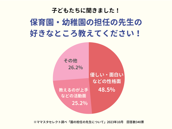 ママスタセレクトでは、今回初の試みとして子どもたちを対象に「保育園・幼稚園の担任の先生の好きなところを教えてください」というアンケートを実施、340人の園児から回答が集まりました。