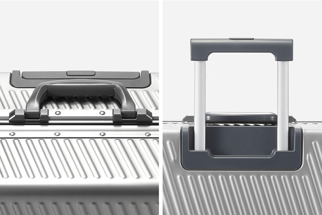 フェードアウトしていく斜めリブラインがアルミの質感を惹きたてる特徴的なデザインのボディ。アルミ製ボディと金属フレームが中身を守ります。気密性が高いため雨に強く、堅牢そうな見た目から防犯性が高い点もメリットです。