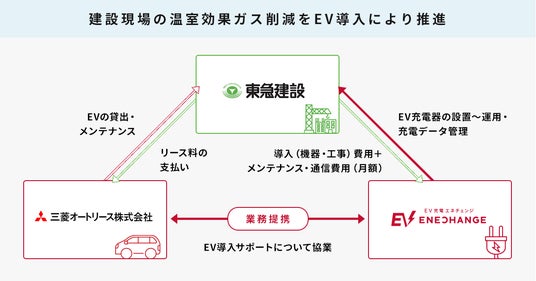 東急建設株式会社(本社:東京都渋谷区、代表取締役社長:寺田光宏、以下:東急建設)、三菱オートリース株式会社(本社:東京都港区、代表取締役社長:中野智、以下:三菱オートリース)、およびENECHANGE(エネチェンジ)株式会社(本社:東京都中央区、代表取締役CEO:城口洋平、以下:エネチェンジ)は、電気自動車(以下:EV)の活用により、建設業界の温室効果ガス排出量削減に向けて共に取り組むことをお知らせします。