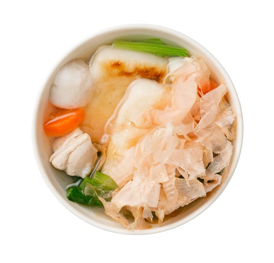 たっぷりとかつお節を散らしたしょうゆ仕立ての味わい深いお雑煮です。