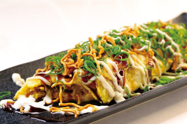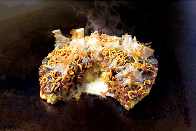 お好み焼の「ふわとろベビースター」は、山芋を使ったふわふわ生地の中にチーズを挟み、ベビースターとともに香ばしく焼き上げました。仕上げにパリポリ食感のベビースターをオン!生地のふわ・チーズのトロッ・ベビースターのパリッとした食感で箸が止まらない美味しさです。