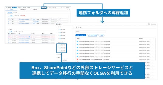 今回の機能により、API連携のみで既存ストレージツール内のデータを「OLGA」とシームレスに連携させることが可能になります。これにより、データ移行作業を行うことなく、日頃業務で利用しているツールはそのままに、過去の案件情報も利活用することができ、OLGAによるナレッジの一元管理や利活用をスムーズに推進できるようになります。