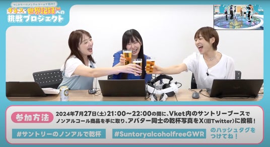 ・記録対象:日本時間2024年7月27日21時~22時の1時間で、バーチャルマーケット2024 Summer内「サントリー」ブースにて、2体以上のアバターが缶とグラス・もしくは缶と缶で乾杯する様子を撮影し、#サントリーのノンアルで乾杯 もしくは #SuntoryalcoholfreeGWRをつけてツイートした1,202投稿