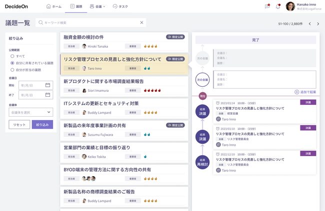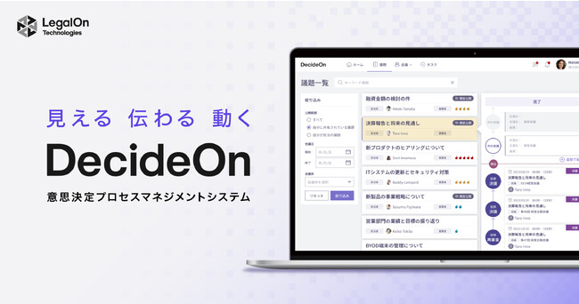 株式会社LegalOn Technologies(本社:東京都江東区 代表取締役執行役員CEO:角田望、以下LegalOn Technologies)は、2023年5月にβ版としてリリースした*会社の意思決定に関するプロセスを可視化するとともにアクションの実行を支援する意思決定プロセスマネジメントシステムの名称が『DecideOn(ディサイド・オン)』に決定したことをお知らせします。