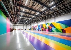 打ち手 : 地域住民と一緒に、工場の壁や床にアート・グラフィックデザインを描き、活気ある空間に。作業エリアごとに異なるテーマカラーやアイコンを設定し、直感的にわかりやすい職場をデザイン。