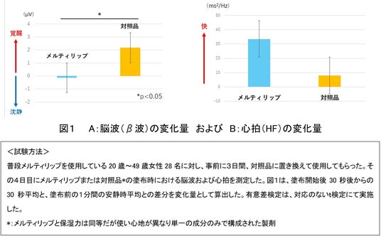当社の先行研究※3において、脳波、心拍、脳血流などの生理指標を測定することで、お客様が潜在的に感じている製品の使い心地に対する「好み」を評価できる可能性を見出してきました。今回、メルティリップを普段愛用されている方が、メルティリップまたは使い心地が異なる対照品を唇に塗布している最中の脳波および心拍を測定しました。その結果、メルティリップ愛用者がメルティリップを塗ると脳波(β波)は低下し、使い心地が異なる対照品を塗ると上昇傾向を示しました(図1A)。一方、心拍のうち、副交感神経の状態を示すHFはどちらも上昇傾向を示しました(図1B)。