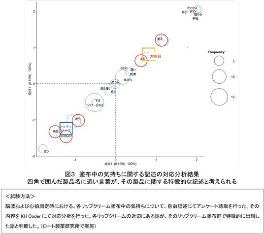 さらに、それぞれのリップクリームを塗布している最中の気持ちについて文章で自由に記述してもらった内容を、対応分析という手法で解析を行いました。その結果、対照品を塗布している最終の気持ちについてはあまり特徴的な言葉が見られず、普段愛用しているメルティリップを塗布しているときには「心地よい」「満足」「潤う」といった言葉が特徴として表れました(図3)。これは生理指標の結果と類似しており、さらには「心地よさ」も感じられている可能性も示唆されました。