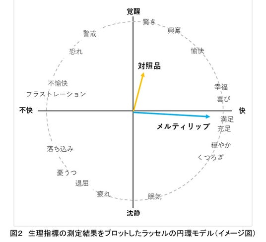 この生理指標の結果を、感情表現モデルの1つであるラッセルの円環モデルに当てはめると、メルティリップを塗布すると「満足」「充足」傾向に、対照品を塗布すると「興奮」傾向を示すことが示唆されました(図2)。この結果から、メルティリップはそのとろける使い心地にこだわった処方により、心が満たされるような感性をもたらしている可能性が示唆されました。