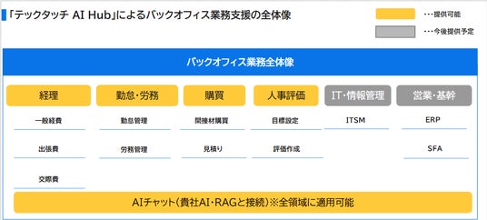 「テックタッチ AI Hub」が目指すバックオフィス業務支援の全体像。まずは経理・勤怠労務・購買・人事から段階的に導入可能(※黄色部分が初期実装領域)