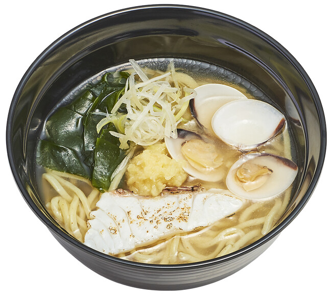 2つ目は、塩生姜らー麺専門店として人気を博す「MANNISH」監修の「塩生姜らー麺」です。たっぷりの生姜とスシローとのコラボならではの、はまぐりや炙った鯛などをトッピングしました。スープは「MANNISH」の味をベースに、野菜や鶏などの旨みを合わせ、スッキリとした塩味に仕上げました。トッピングの生姜をスープと混ぜることで生姜風味のスッキリとしたスープに進化し、魚介のトッピングとの相性も抜群です。