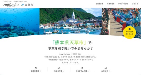 このたび天草市とrelayは、移住・定住を伴う第三者事業承継の推進に向けて、共に取り組んでまいります。提携の第一弾として、天草市に特化した後継者募集案件を掲載した「relay the local 天草市」を開設いたしました。今後、天草市に相談が寄せられる後継者不在事業者の情報をrelayに提供いただき、「relay the local 天草市」への掲載を行います。