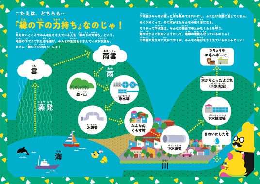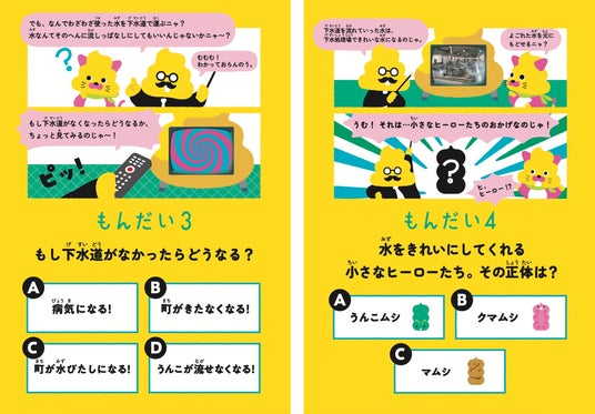 親しみやすく可愛らしいイラストとテンポよく展開されるストーリーで子どもの興味を惹きつけながら、クイズを通じて下水道の役割や重要性、処理された水がどのように環境に戻されるのかなどを学ぶことができます。