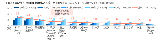 観戦したスポーツは、「FIFAワールドカップ」「日本のプロ野球」「高校野球」で20%台。特に、女性50~60代において「フィギュアスケートなどの冬季スポーツ」観戦経験が他の競技を押さえて最も高かった。また、60代は、サッカー以外のスポーツ観戦経験の高さが目立つ。<図2>
