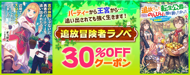 勇者のパーティーから追放されたり、クーデターを起こされて追放されたり――そこから新たな人生を歩み出す大人気”追放系ラノベ”。 「auブックパス」では、『真の仲間じゃないと勇者のパーティーを追い出されたので、辺境でスローライフすることにしました』や、『追放された転生公爵は、辺境でのんびりと畑を耕したかった ~来るなというのに領民が沢山来るから内政無双をすることに~』など、人気ラノベ作品を対象とした30%OFFクーポンを配布するフェアを開催いたします。強く生きる主人公と、その活躍に胸躍る展開! ぜひこの機会にお楽しみください。