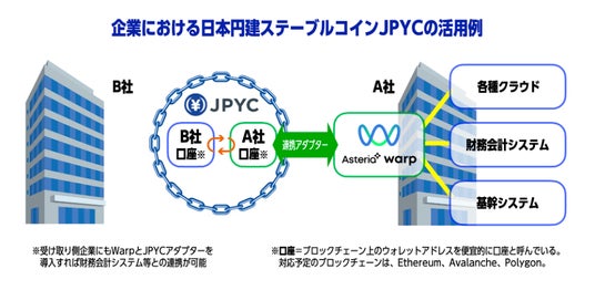 アステリア株式会社(本社:東京都渋谷区、代表取締役社長:平野洋一郎、証券コード:3853、以下 アステリア)は、JPYC株式会社(本社:東京都千代田区、代表取締役:岡部典孝、以下 JPYC(株))が発行する日本円建ステーブルコイン※1「JPYC」の決済データをノーコードで連携することの出来るASTERIA Warp専用「JPYCアダプター」(以下 新JPYCアダプター)を開発することを発表します。