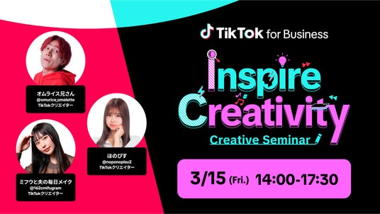 「Inspire Creativity -TikTok for Business クリエイティブセミナー-」は、広告主・ビジネスオーナー・広告代理店を対象に、「TikTokへの出稿に興味はあるけど、どうやって始めたらいいの?」「TikTok専用のクリエイティブ制作ってハードルが高そう」「パフォーマンスの高いクリエイティブ制作のために抑えるべきポイントは?」などさまざまな疑問にこたえる、TIkTokのクリエイティブ制作をテーマにしたオフラインイベントです。