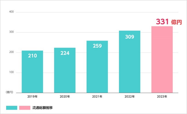 DX化を推進しオンラインサービスに注力した結果、売上が堅調に推移し2023年度の流通総額は前年の2022年度を+31億円上回る331億円に達しました。