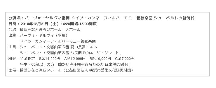 2006年の横浜みなとみらいホールにおけるベートーヴェン交響曲全曲演奏会をスタートに、続くシューマン、ブラームスの交響曲演奏で世界的な評価を得てきたパーヴォ・ヤルヴィ指揮ドイツ・カンマーフィルハーモニー管弦楽団。かねてより次に取り組む作曲家としてシューベルトを挙げていた両者は、いよいよ今年3月ブレーメンとウィーンでシューベルトの交響曲演奏をスタートさせました。ヤルヴィが語るその内容は「従来のロマン派寄りの美化された演奏スタイルではなく、むしろベートーヴェンの側からシューベルトの音楽にアプローチしたい」というもの。まさに新時代のシューベルト演奏が期待されます。今年12月の来日ツアーで日本初披露となる両者によるシューベルト。シューベルトのみに焦点を当てた横浜公演では、交響曲第5番と第8番の名交響曲2曲をじっくりお聴きいただけます。