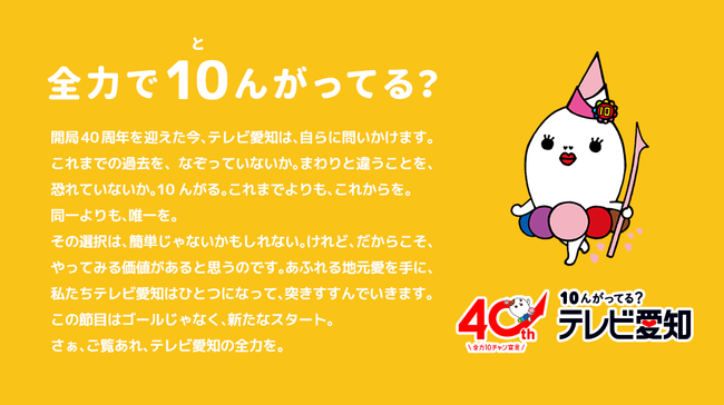「これからもテレビ愛知らしく、とんがり、突き進んでいく」。これまでの「愛知への感謝」「愛知への愛」を胸に、心に刺さる‟10んがってる“企画を全力でお届けします!