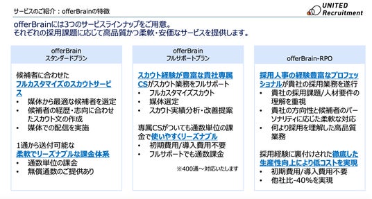 ユナイテッド・リクルートメント株式会社が運営する「offerBrain( https://offerbrain.jp/ )」とは、採用活動における「スカウト代行及びコンサルティング」と「RPO」を提供するサービスです。IT領域を得意とし、スカウトから採用に向けて伴走します。現状お抱えの課題をヒアリング後、複数のサービスプランから課題/組織体制にあった内容のサービスをご提供し、採用の成功に寄与いたします。