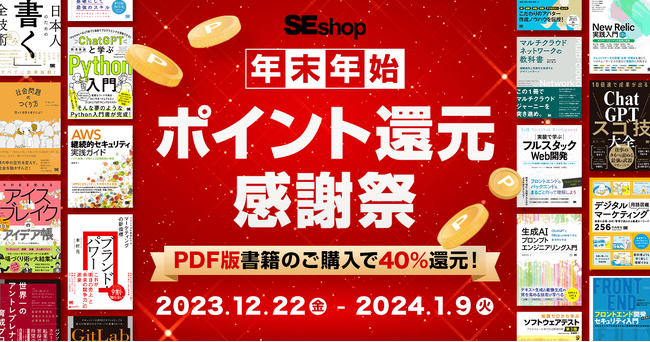 株式会社翔泳社(本社:東京都新宿区⾈町5、社長:佐々木幹夫)の運営する公式通販サイトSEshopは、 2023年12月22日(金)から2024年1月9日(火) まで、新刊含むPDF版電子書籍約1500タイトルが40%ポイント還元となる「年末年始ポイント還元感謝祭」を開催します。