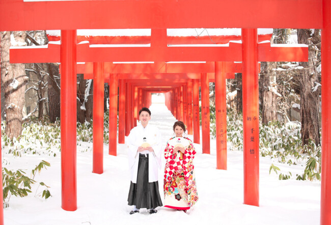札幌市中央区にある伏見稲荷神社は、赤い鳥居が連なることで知られ、冬には白い雪と赤い鳥居の組み合わせが美しく、その情景を楽しもうと海外からたくさんの観光客が訪れます。パワースポットで有名な神社となり、フォトウェディングとしても人気のスポットとなっております。