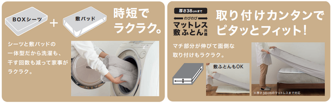 のびのび伸縮するのでシワも目立たず、より簡単に装着できます。また、敷き布団にもラクに取り付けられるようになりました。BOXパッドを付けたまま布団を折り畳むことができるため、使う時も付け直しする手間が省けてとても便利です。