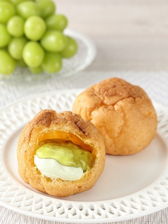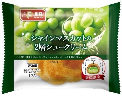 「E-WA! シャインマスカットの2層シュークリーム」は、国産のシャインマスカット100%使用の“シャインマスカットクリーム”と“シャインマスカットソース”の2層仕立てです。こんがりと焼き上げたシューパフに、たっぷりのなめらかクリームと濃厚なソースを詰めました。人気のスイーツシリーズから、8月31日(土)までの期間限定販売です。